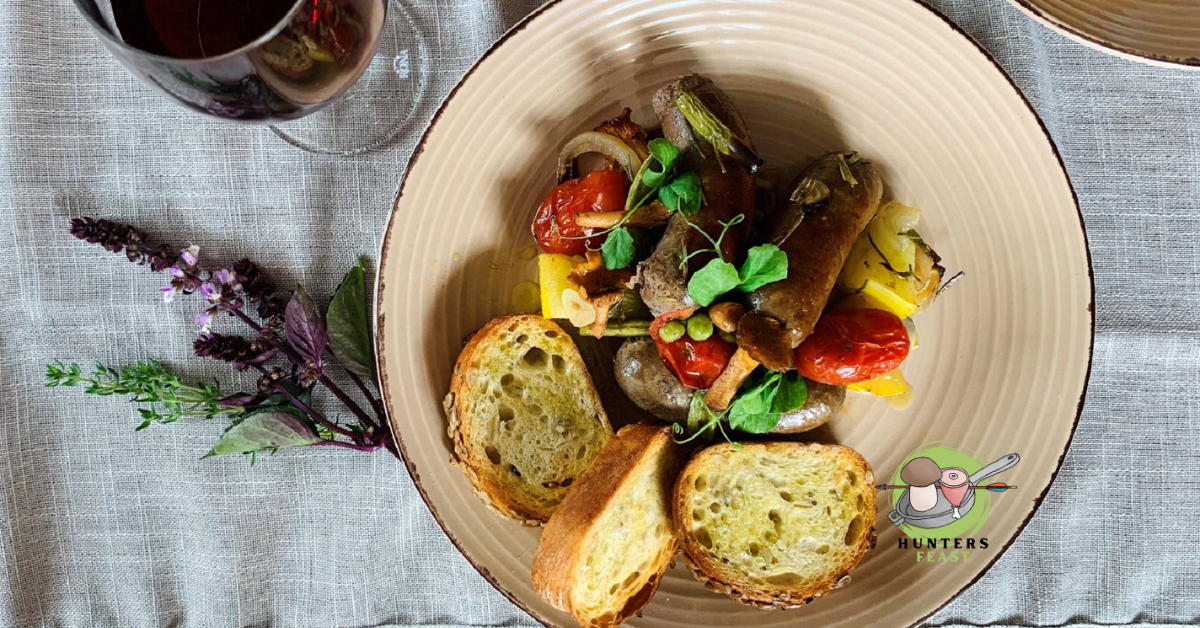 - The sausage roast: prepare all the vegetables, mushrooms. Wash or brush mushrooms (in my case chanterelles) so they are clean and throw into a baking tray. Roughly chop onion, garlic and courgetti and throw into baking tray too. Add lima beans and peas (fresh or frozen, if frozen - defrost them under running water). Add cherry tomatoes, pour in red wine and stock. Here You can add sausages and roast everything at 425F for 25 minutes or I advise You to roast vegetables separately for 25 minutes and then add sausages, drizzle over some olive oil and roast for another 16-20 minutes or until they are just cooked. Serve with toasted bread and a glass of red wine. Big GameTraditional